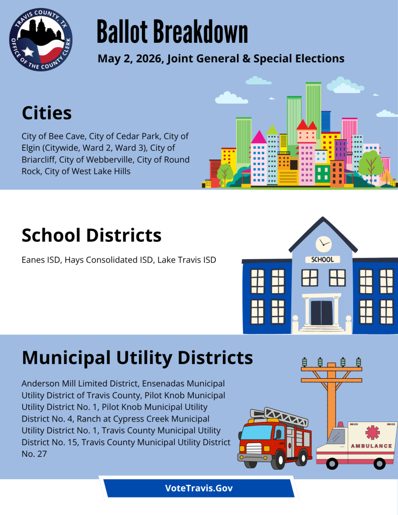 If you receive a “Voter Information Not Found” message you may not have a ballot for the May 2, 2026, Local Election. Please see the below Ballot Breakdown for eligible jurisdictions on the ballot. Please call 512-238-8683 with any questions.